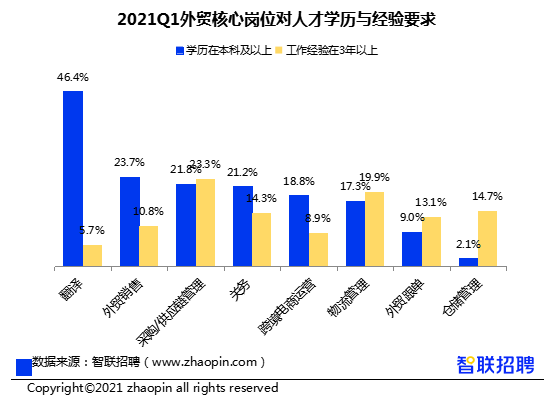 外贸岗位中,翻译重学历、供应链/物流管理重经验、跨境电商运营门槛宽松