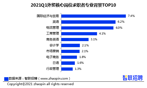 从核心岗位求职者专业背景来看,与行业对口情况较好,国际经济与贸易最为普遍,占比7.4%,物流管理、工商管理、会计学、市场营销、电子商务等经管类专业也均位列前十。此外,由于外贸对语言能力的要求,毕业于英语(6.2%)、商务英语(3.1%)、日语(1.6%)等专业求职者在外贸进出口行业中占比也相对较高。