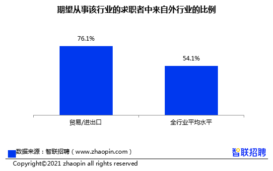 有趣的是,期望进入外贸行业的人才中,76.1%来自其他行业,这一比例高于全行业平均水平(54.1%)。可见,虽然外贸行业整体人才吸引力不足,但依然获取到外部行业源源不断的人才供给,人才来源的丰富性也为未来外贸人才增长提供空间。