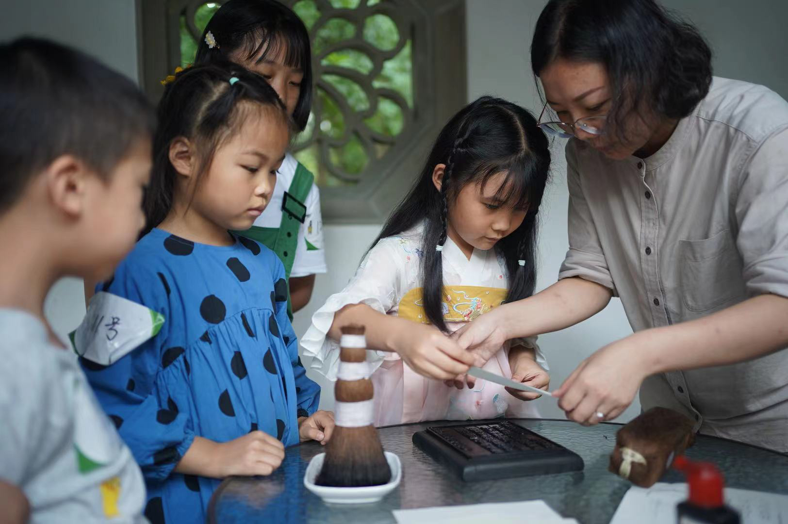 午后,大家来到杜甫草堂,在讲解员的带领下,开启了一段杜甫草堂深度游,亲身感受诗圣杜甫笔下的成都。在草堂艺术中心的“杜诗”拓印,孩子们通过互动参与了解拓印知识,更体味了《春夜喜雨》《江村》两首诗的创作背景。
