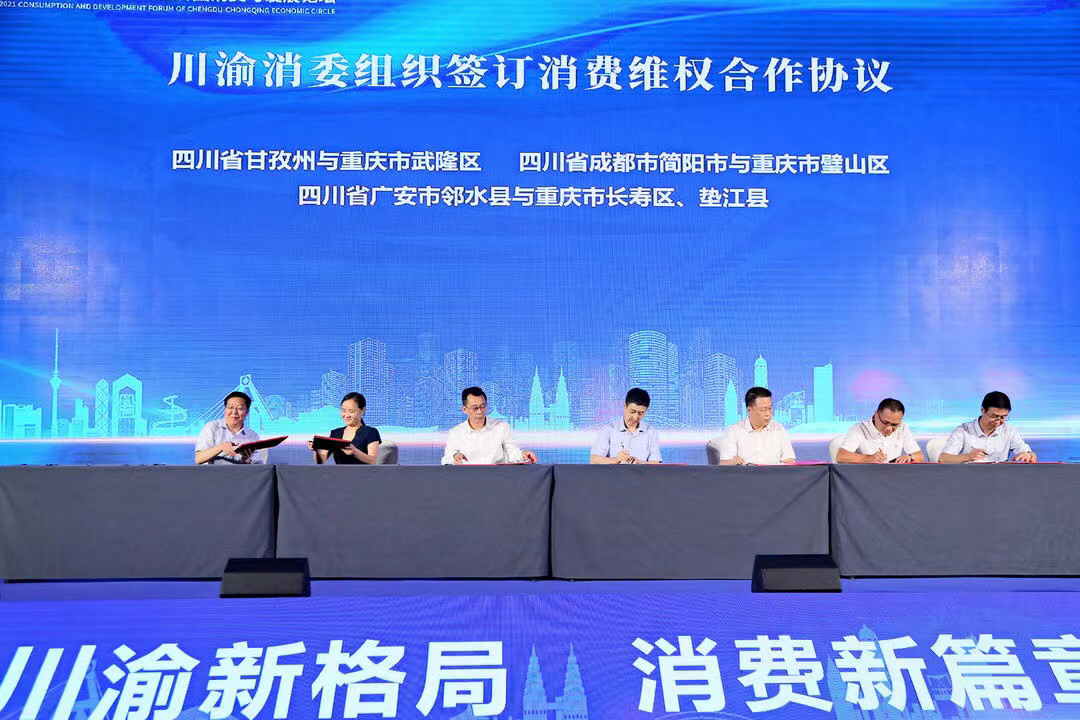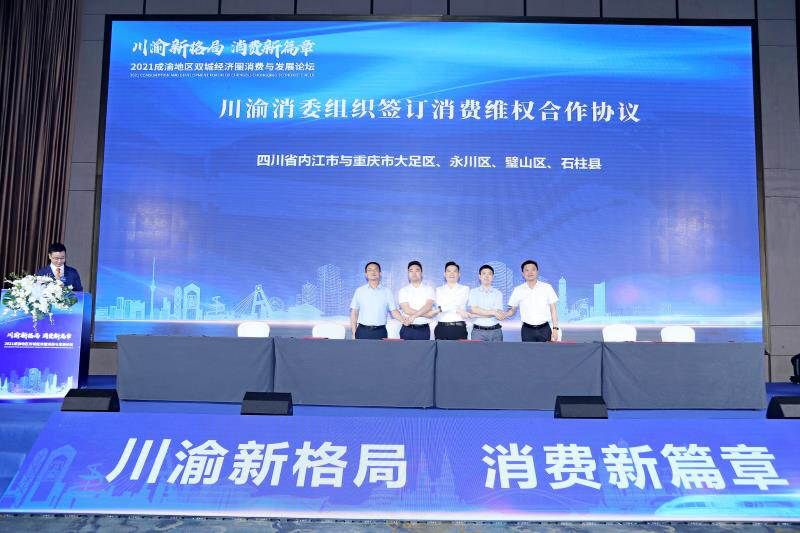 川渝新格局,消费新篇章。9月6日,"2021成渝地区双城经济圈消费与发展论坛"在四川省内江市举行。由四川省保护消费者权益委员会和重庆市消费者权益保护委员会共同主办的此次论坛,围绕推动川渝两地市场监管一体化合作、共护消费者合法权益、共促消费提质升级等话题深入交流,为促进成渝地区双城经济圈消费与发展、满足川渝两地人民日益增长的美好生活贡献智慧。据悉,这也是川渝两地消委组织首次联合举办高规格的研讨活动。