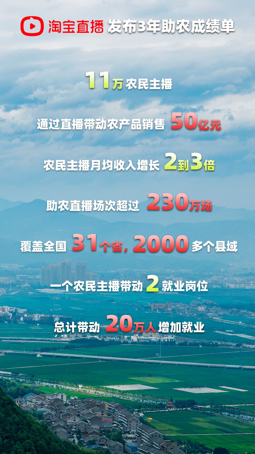 “拿起手机做主播,一年收入翻一番”,淘宝直播让许多农民的生活发生了质的变化。“村播计划”负责人唐溢介绍,目前农民主播已经遍布全国31个省,2000多个县域。在学会直播后,农民主播的平均月收入能够提高两到三倍,人均能够带动2个就业岗位,共计拉动了20万人就业致富。手机成为新农具、直播成为新农活、数据成为新农资,这些已经成为农村越来越常见的变化。“我们建立了超过100所‘村播学院’,为农民提供直播培训课程、直播间现场实战演练等,为农民主播提供从基础设施支持、人才孵化培训到地域品牌设计、直播带货产业规划扶持、政策引导和资源协调方面的全方位支持。致力于帮助农民学会、用好‘新农具’,做好‘新农活’。”唐溢介绍,作为中国最大的农产品电商平台,整个淘宝上1/4的网店都来自农村,淘宝正在吸引越来越多的年轻人回到乡村,投身关注农业、关心农村的事业中。(图片由淘宝直播提供)
