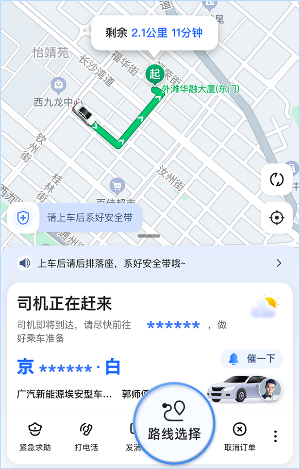 高德打车还为乘客选路提供了方便。新上线的“路线选择”功能,在默认路线外,为乘客提供了更多的路线选择。乘客叫车成功后,点击“路线选择”按钮,高德打车将按照乘客所在位置给出实时的路线推荐,路线信息包括抵达目的地的距离、时间和红绿灯数量等。不同路线全程的预估价也会同时展示,方便乘客参考。