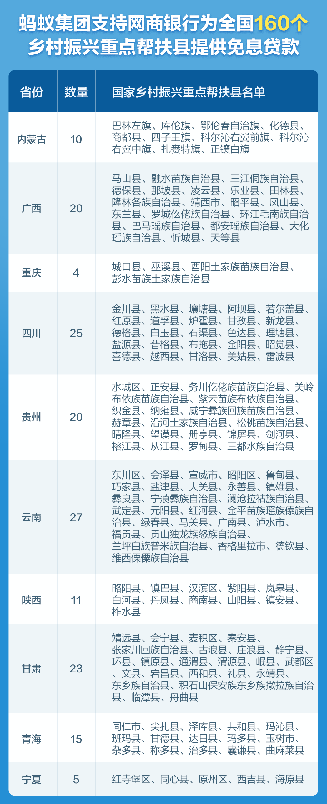 8月27日,中央农村工作领导小组办公室、国家乡村振兴局公布了160个国家乡村振兴重点帮扶县名单,分布在内蒙古、广西、重庆、四川、贵州、云南、陕西、甘肃、青海、宁夏等10个省、自治区。此次蚂蚁集团发起的免息贷款活动将全部覆盖这些县域。