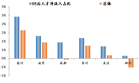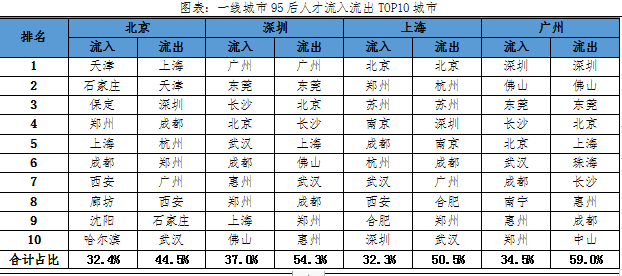 2、二线城市中,成都、杭州对95后人才集聚程度更高,人才净流入占比分别高出总体0.8、1个百分点;95后人才大部分为城市群内部流动,由于武汉地处主要经济带中心、九省通衢,其人才来源地丰富,前十大城市来自9个不同省级行政单位。从人才净流入占比看,前十强二线城市杭州、南京、成都、苏州、武汉、郑州的95后人才净流入占比分别为2.4%、1.3%、0.9%、1.2%、0.7%、0.2%,较总体分别高出0.8、0.4、1.0、0.4、0.5、0.7个百分点,杭州、成都对95后集聚程度更高。从来源和去向看,杭州流入流出城市前两名均为北京、上海,合计占比分别为7.8%、15.8%,杭州发展所需人才主要在一线城市中,杭州也具有从一线城市抢夺人才的能力;南京流入流出城市均有8个位于长三角地区,合计占比分别为21.5%、41.5%,南京和长三角的人才互动非常频繁,部分因为南京高校较多,长三角人才为求学向南京集聚,毕业后从南京回流至长三角其他城市;95后人才向成都流入和从成都流出的前十大城市合计占比分别为35.3%、43.6%,流出成都的城市更集中;苏州流入流出城市均有5个在长三角地区,占比分别为18.7%、36.8%,其中上海对苏州虹吸效应明显,从苏州流向上海95后人才占比为14.6%;武汉地处长江与京广铁路大动脉的十字交汇点,有“九省通衢”之称,95后人才来源地遍布各地,前十城市中来自9个不同的省级行政单位。流出武汉的城市更集中,其中流出前四大城市为深圳、北京、上海、广州,均为一线城市,合计占比27.5%;流入郑州城市有9城位于中原城市群,占比35.9%,流出郑州城市有6城位于中原城市群,其余4城为北上深广。