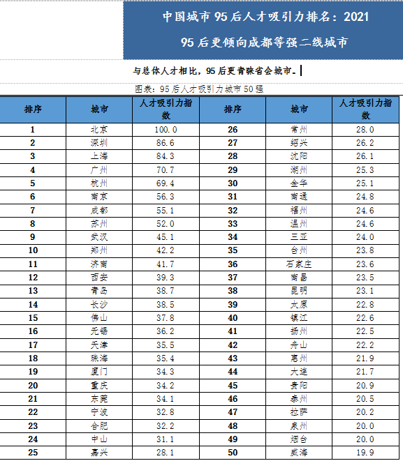 中国城市95后人才吸引力排名:95后更倾向成都等强二线城市
