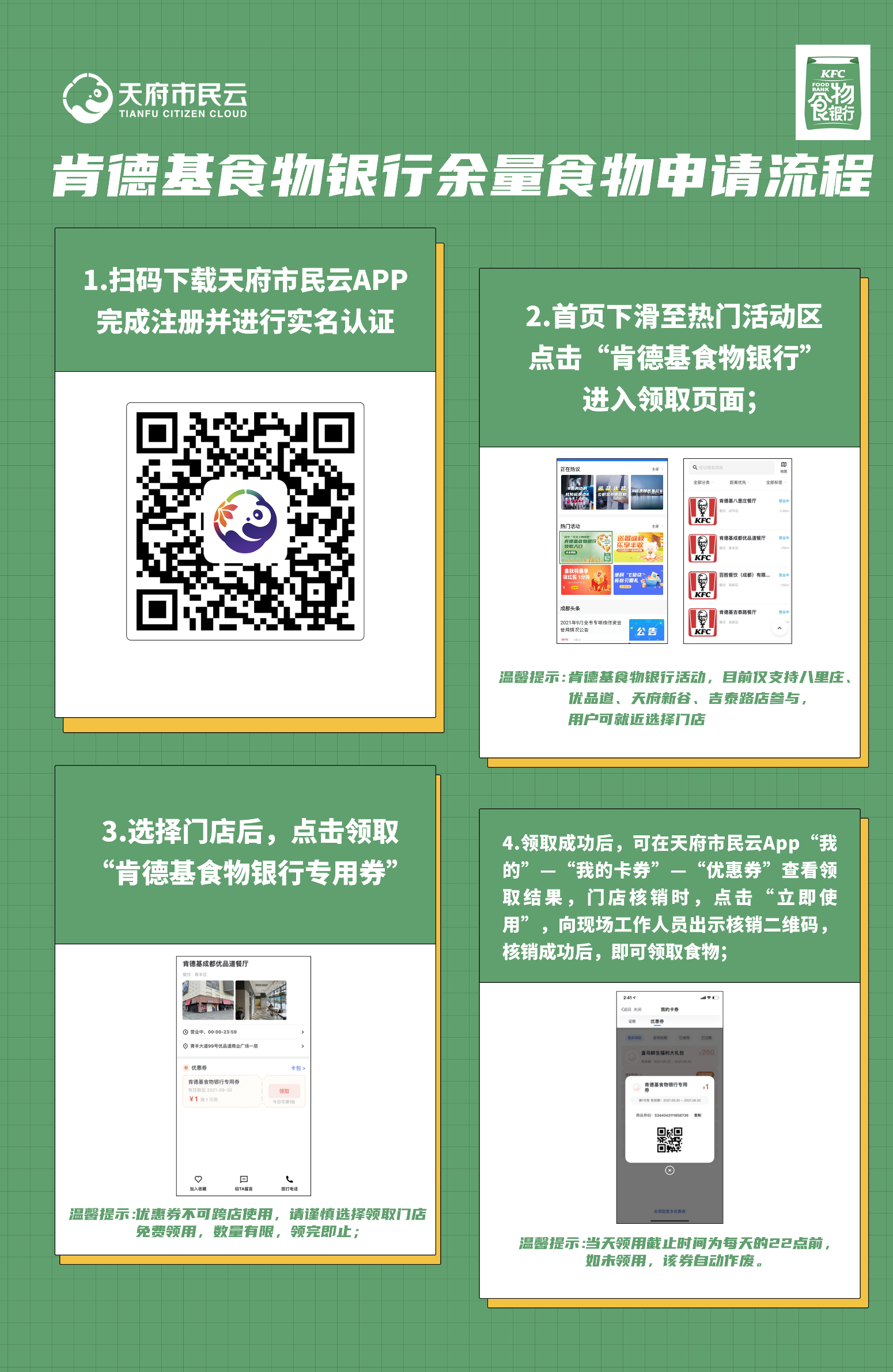 市民只需打开天府市民云App,点击对应活动页面,选择就近的肯德基餐厅,即可领取“食物银行”专用电子券。凭该券前往对应的线下餐厅,出示核销即可领取免费食物。用户也可在App搜索框输入“肯德基”进入活动页。