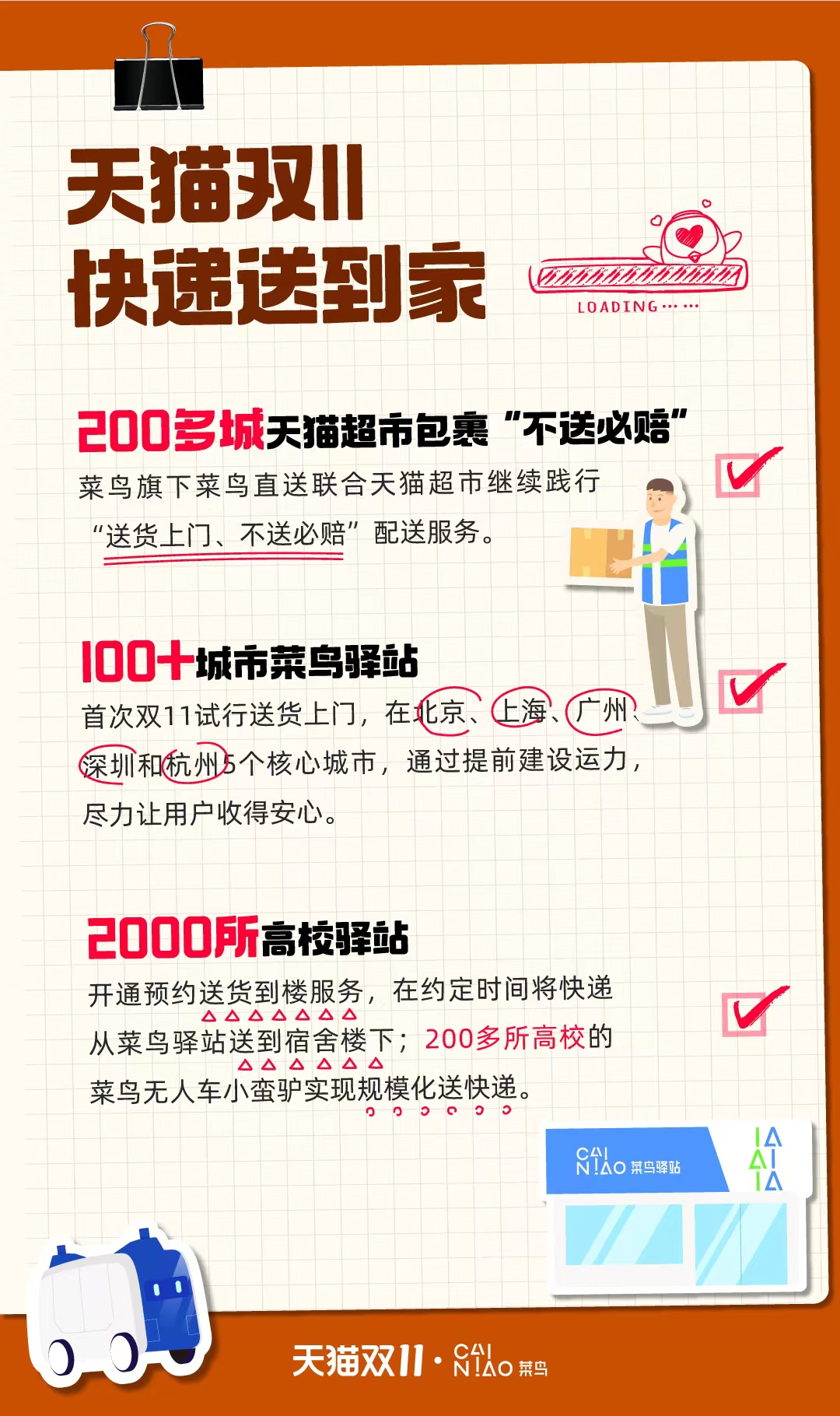 与一贯坚持送货上门的天猫超市与菜鸟直送不同,菜鸟驿站在提供免费保管之余,这个双11,在全国100多个城市也会根据消费者需求首次提供天猫淘宝包裹的送货上门服务,尽力让消费者在双11收得放心。