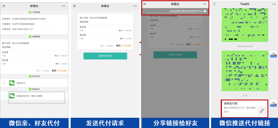 考虑老年人手机线上支付应用率较低,移动端支付困难,增加“亲/好友代付”功能。老年患者需要移动端付费时,只需点击“帮我付”就会自动生成一条微信好友代付链接,推送链接至亲友,亲友代付缴费后即完成。同时,还增设快速联通客服电话渠道,快速解决操作过程中遇到的各项系统问题。