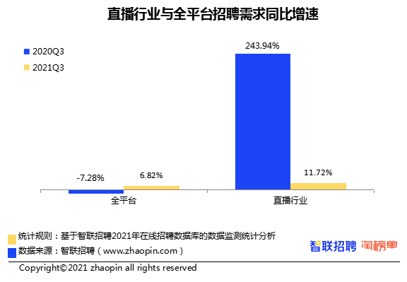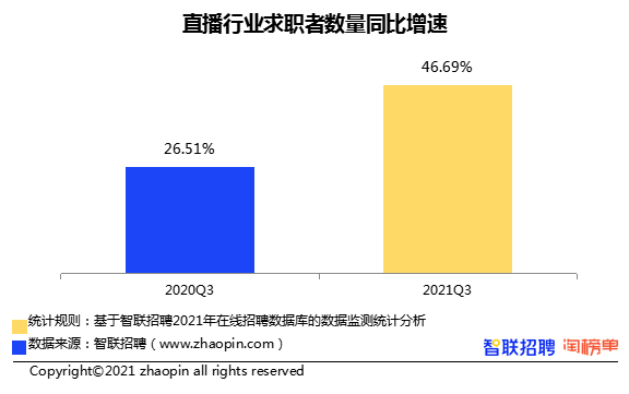 看度记者了解,行业升温不仅掀起了全民直播浪潮,也点燃了人才的求职热情。智联招聘数据显示,2021年第三季度直播行业招聘职位数同比增加11.72%,大于全平台岗位增幅的6.82%;直播岗位的求职人数同比增加46.69%,求职者增幅明显大于岗位增幅。