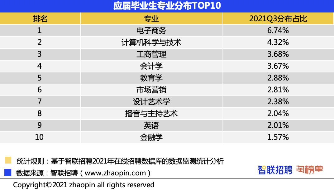 智联招聘数据显示,2021年第三季度,直播行业大学生求职人数同比增加69.52%,高于行业总体求职人数增幅的46.69%,可见直播行业对大学生吸引力提高更多。应届毕业生专业分布方面,电子商务、计算机科学与技术占据前两位。随着行业的发展,人们对直播的固有印象正在发生改变,尤其是对新兴事物充满好奇的95后、00后年轻群体,与直播相关的职位渐成其理想职业。智联招聘9月发布的《2021Z世代职场现状与趋势调研报告》显示,有10.9%的95后、13.8%的00后想成为电商主播,这一职业排在“Z世代想从事的新兴职业”第三位。