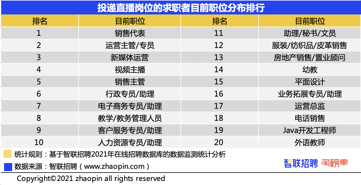 从求职者专业分布和不同岗位求职者数量变化来看,求职者从事的岗位相关性较高,销售、运营占比高。这种岗位相关性高的趋势也蔓延至人才市场。2021年,向直播岗位投递简历的求职者中,当前从事销售与运营的人才数量较多,这两种职能与直播的运营、销售、商务BD岗位也较为对口。人数排名前5的职位小类分别为销售代表、运营主管/专员、新媒体运营、视频主播、销售主管。此外,教育相关岗位的求职者也出现向直播岗位流动的趋势,或与产业调整相关,同时教育相关从业者本身具备的良好的表达能力也是他们进入直播行业的先天优势。