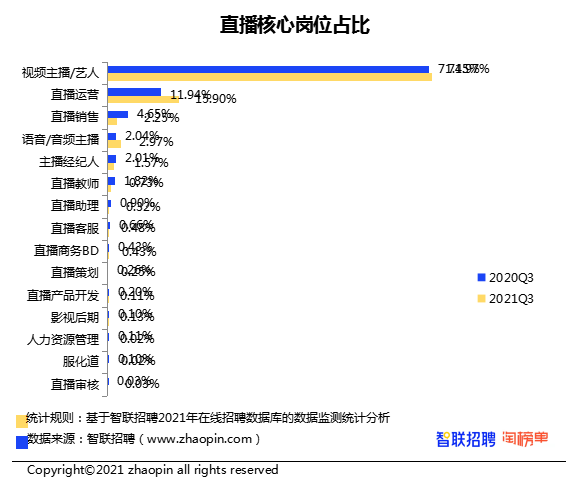 大量企业在双11到来之前集中进行直播人才贮备,因此基于2021年第三季度在线大数据,看度记者了解到,智联招聘携手淘榜单共同发布《2021年直播产业人才报告》,对人才市场供需关系进行探究,呈现直播产业发展面貌。