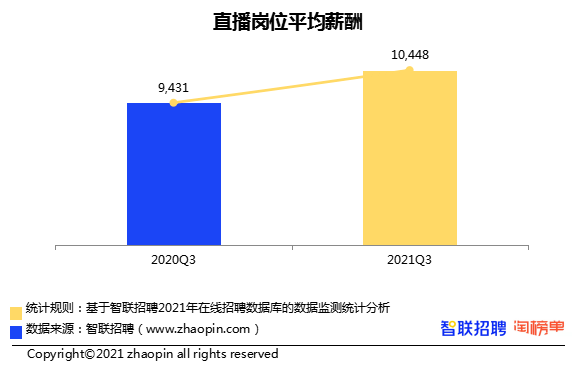 2021年第三季度,直播相关岗位平均薪酬同比上涨10.78%,达到10448元,突破“万元大关”。其中,直播产品开发岗位平均薪酬最高,达26372元。直播教师、视频主播、直播商务岗位平均薪酬也突破万元。