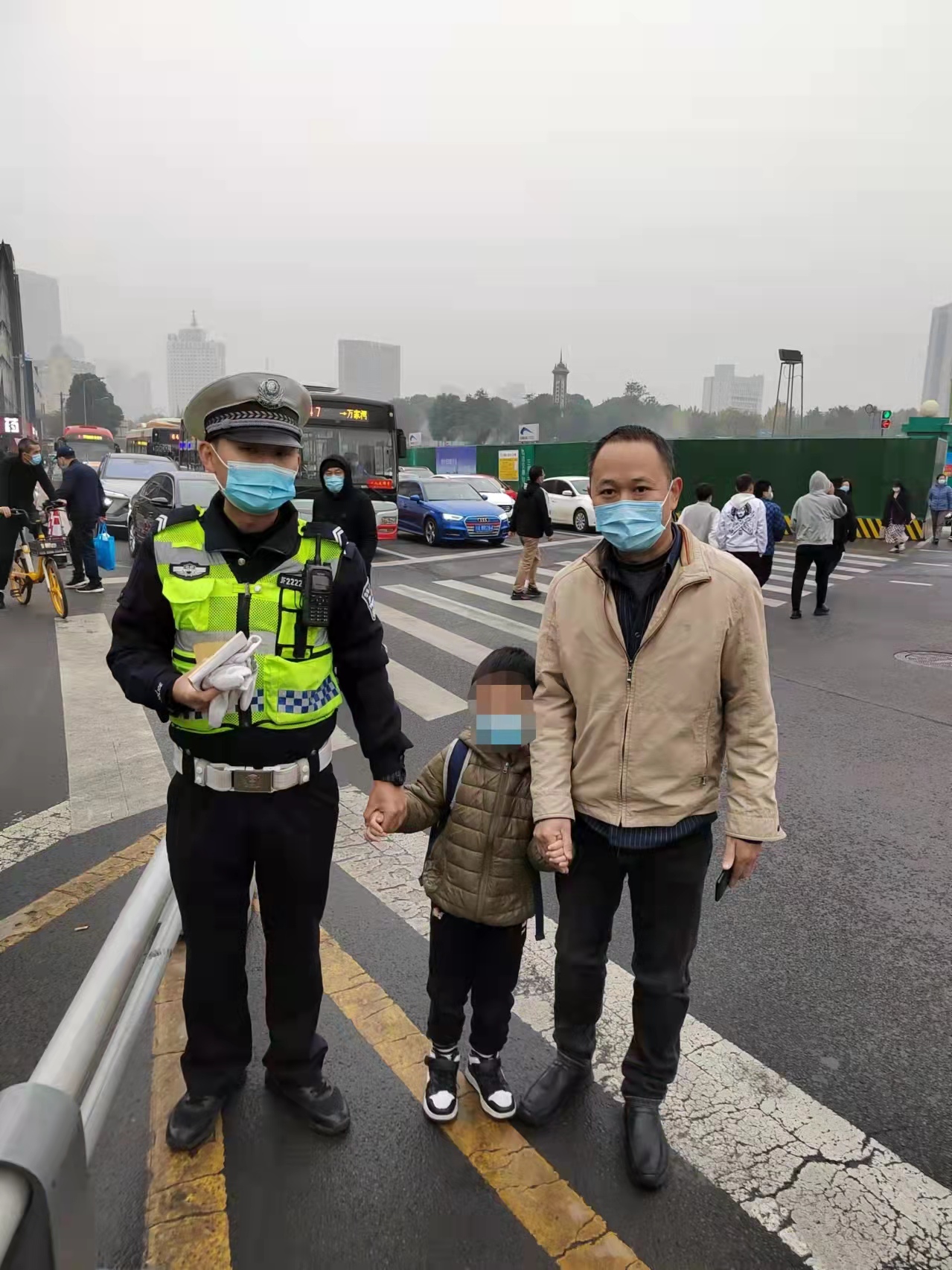 幼儿走失,情况紧急!民警一边安抚老人情绪,一边通过电台联系小南街路口警力。小南街执勤的协警刘晶得知情况后立即将驶来的公交车拦下,上车仔细寻找。所幸因发现及时,刘晶很快在公交车上找到了小朋友,将小朋友抱下了公交车,并将情况通报给人西路口执勤的民警。刘刚得知信息后立即告知老人,因两路口相距仅百余米,民警仔细给老人说清楚小朋友所在的地方后,老人立即赶往小南街路口。