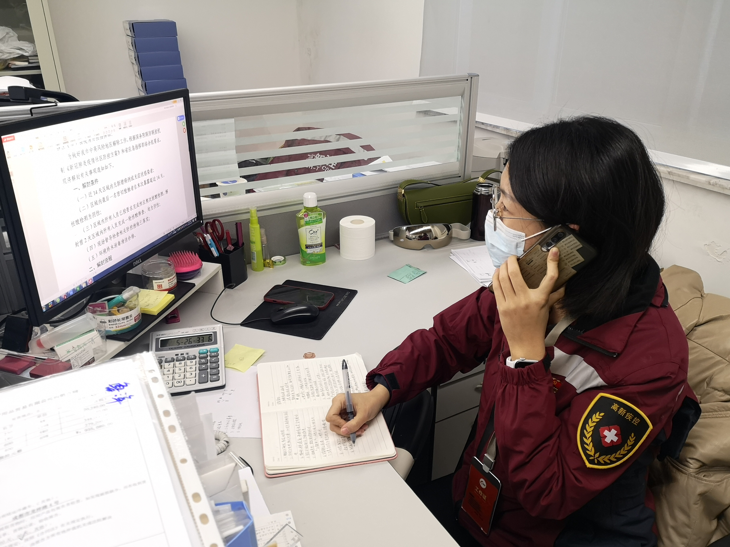 “今天能回来吗?”“悬,可能你要给我送衣物了……”这是“11.2”成都本土疫情发生时,成都高新区教文卫健局卫生健康处廖坤和他爱人的对话。在本轮疫情防控工作中,廖坤和同事承担起高新区集中隔离场所的设置与防控、闭环管控服务管理、风险人群转运、协调入住隔离场所及海量的群众咨询工作。连续10多天回不到家、睡不了觉、见不到女儿,情况紧急时,72小时内仅休息5个小时,一天接到100多个电话,高强度的工作量和压力之下,廖坤依然保持着“大嗓门”和紧绷负责的态度。他说,大嗓门就是他保持工作状态的“不二法宝”,更是他“疫情不退他不退”的决心体现。