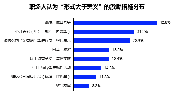在被问及哪些激励措施“形式大于意义”时,42.8%的职场人认为是跳操、喊口号等激励方式,占比最高;31.2%的职场人认为,年会、邮件、内网等公开表彰是在做“表面文章”;28.9%的职场人表示,通过公司“荣誉墙”等进行员工照片展示华而不实。