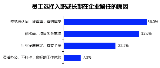 在被问到“哪一项最有可能成为你选择该企业或者长期留在该企业的原因?”时,36.0%的职场人选择“被认同、被尊重、有归属感”,占比排在第一位,高于“薪水高、项目奖金丰厚”的32.6%;22.5%的职场人基于行业发展稳定等大环境优越而留任。可见,企业留住人才的关键是给予充分尊重,让其有归属感,其次才是“钱给足”。