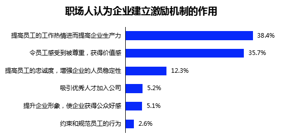 对于激励机制的作用,38.4%的职场人认为,企业建设激励机制“有利于提高员工的工作热情、工作动力,进而提高企业生产力”;其次是35.7%的职场人认为,激励机制有助于“令员工感受到被尊重,获得价值感,和企业一起创造更大价值”;仅12.3%的职场人认为,激励机制可以“提高员工的忠诚度,增强企业的人员稳定性”。