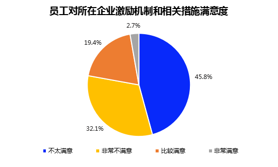 根据智联招聘数据,45.8%受访的职场人对企业的员工激励机制“不太满意”,32.1%的职场人则表示“非常不满意”;只有19.4%和2.7%的职场人对企业激励机制表示“比较满意”和“非常满意”。可见,企业激励机制的建立普遍不够理想,还有较大提升空间。