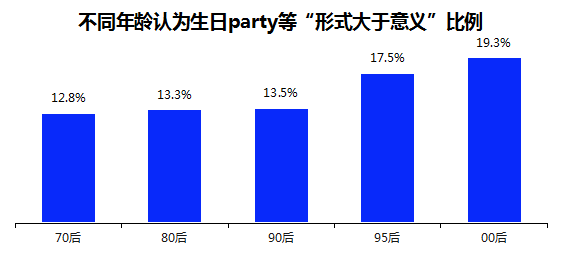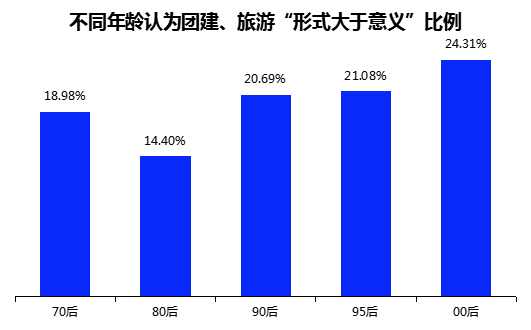 值得一提的是,对于团建、生日Party等具有物质与精神双重属性的激励机制,年轻人并不“感冒”。21.1%的95后和24.3%的00后认为,团建、旅游等激励方式“形式大于意义”,占比高于70后(19.0%)、80后(14.4%)、90后(20.7%)。同时,17.5%的95后和19.3%的00后“不待见”生日Party等庆祝活动,占比也高于总体占比的14.3%。