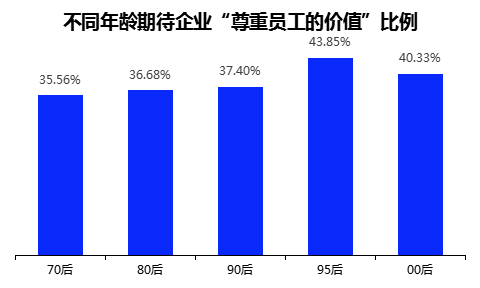 从不同年龄来看,Z世代职场人比“前辈”更看重“被尊重”。分别有43.8%的95后、40.3%的00后选择“尊重员工价值”,而70后、80后和90后选择该选项的受访者分别占比35.6%、36.7%和37.4%。企业若能充分尊重Z世代的意见,将更好地调动其积极性和主动性。