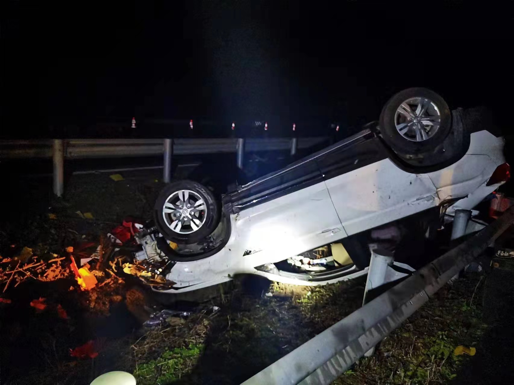12月11日晚23时许,绵遂高速遂宁段交警接到监控中心报警,辖区绵阳至遂宁方向217km处,一辆小型普通客车侧翻至中央隔离带,护栏、立柱破损严重,现场无人受伤,民警立即出警赶赴现场。