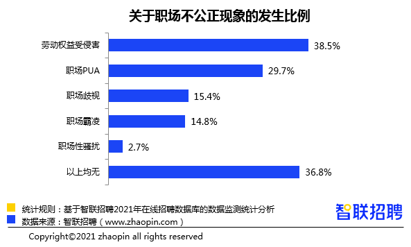 智联招聘数据显示,2021年,43%的男性劳动权益受到侵害,比女性的30.6%高出12个百分点。可见,近年来社会对女性权益的关注让她们得到更好的保障,与此同时应该意识到对男性劳动权益的保障也不容忽视。有29.7%的成都白领在2021年经历过职场PUA,占比高于2020年的18.1%。