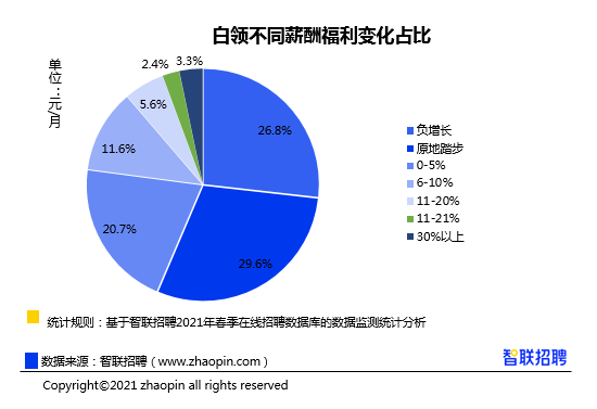 2021年,43.6%的白领薪资有所增长,占比高于2020年的41%。不过降薪白领占比26.8%,比2020年的24.9%更高。此外,29.6%的白领薪酬原地踏步,比2020年的34.1%下降。