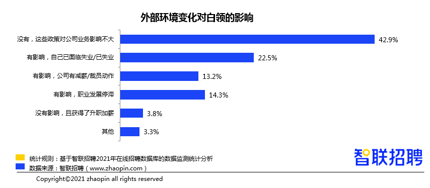 2021年,反垄断、“双减”等政策出台,42.9%的成都白领表示受到不同程度影响:22.5%的成都白领面临失业或已失业,13.2%的白领所在公司有减薪裁员动作,14.3%的白领职业发展停滞;也有3.8%的白领表示没有受到影响。