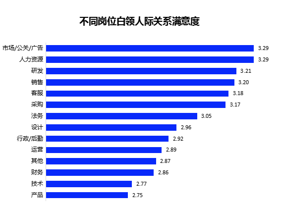 从不同岗位来看,人力资源、市场/公关岗位白领对人际关系满意度指数更高,均为3.29。由于这两大岗位“与人打交道”的时间较多,白领在职场磨砺中对岗位的适应性越来越高,应对人际关系也更加得心应手。