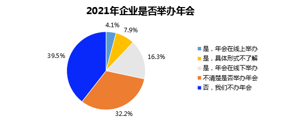 疫情爆发以来,年会从过去企业年终的必选项,变为锦上添花的项目。2021年,39.5%的白领所在企业不办年会,占比超过2020年的37.6%。仅4.1%的白领所在企业通过线上方式办年会,占比远低于线下年会的16.3%。