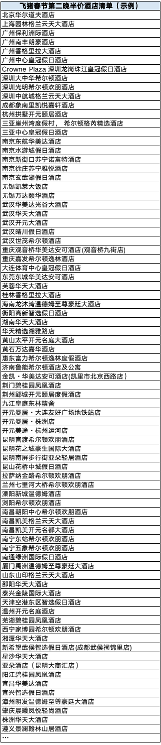 为把握节日消费旺季的契机,在线旅游平台、旅游商家针对人们消费习惯的新变化,提供更实惠的出游产品,丰富消费者过节选择。飞猪推将出酒店春节连住“第二晚半价”活动,消费者在1月25日至2月6日期间,预订带有“第二晚半价”标识的春节酒店,可享受第二晚半价的优惠。据了解,该活动覆盖上百个城市,包括北京、上海、杭州、三亚、广州、深圳、南京、武汉、长沙等热门目的地,北京华尔道夫酒店、广州香格里拉大酒店、三亚中心皇冠假日酒店、上海园林格兰云天大酒店、南京玄武湖假日酒店、深圳龙岗珠江皇冠假日酒店等上万家酒店均在此补贴范围内。