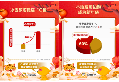 新时代文旅研究院研究员郭亮认为,2022年春节,本地游、周边游和近郊游仍是多数就地过年消费者的选择。酒店过年潮将持续升温,冰雪和民俗或是两大热门旅游主题。在线旅游企业和商家需根据春节市场变化及时调整产品策略,不仅要丰富供给,更要创造供给催生新需求。可以预见的是,历经三年的结构性调整和重塑,短途游已基本实现量价齐升与提质升级,这必将成为我国旅游业恢复与振兴的基础力量。(图片由飞猪提供)