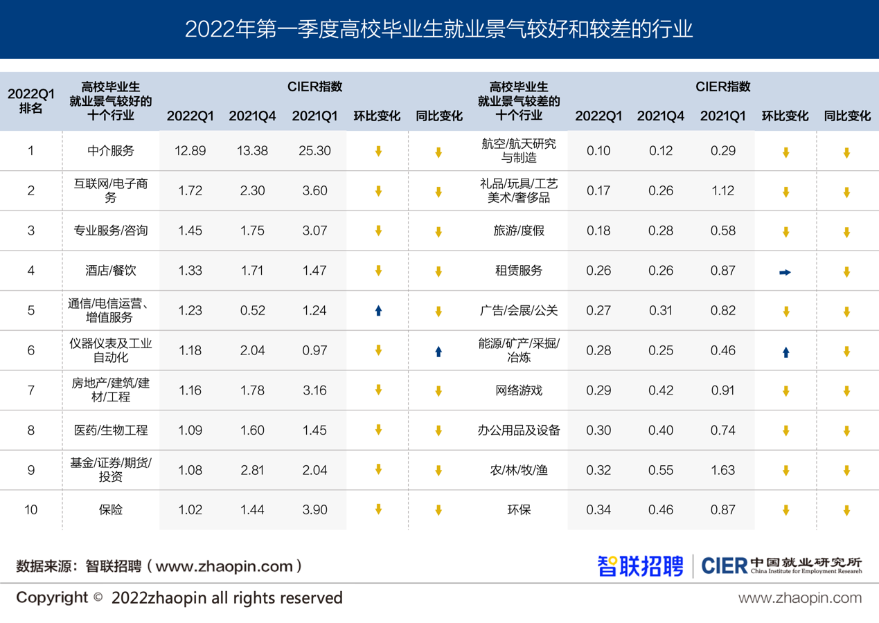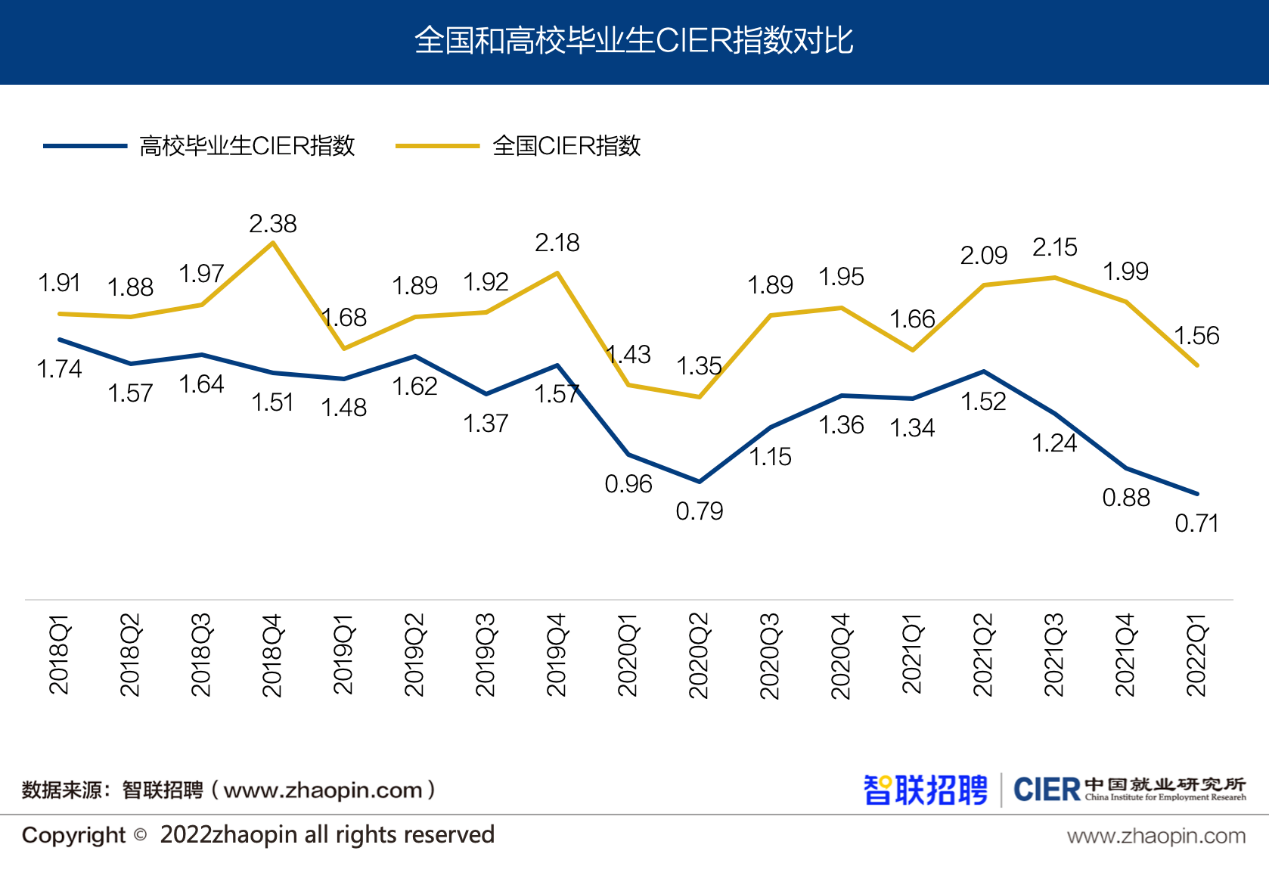 随着国内疫情反复、经济下行等因素影响,据看度记者了解,2022年一季度高校毕业生CIER指数为0.71,降至2020年疫情暴发以来最低点,且明显低于全国水平。与2021年一季度(1.34)和四季度(0.88)相比,本季度高校毕业生就业景气指数同环比均有所下降。本报告运用网络招聘大数据,从高校毕业生总体就业市场状况,以及不同行业和职业、不同区域和城市、不同企业规模和性质等方面进行全方位分析,得到如下几点结论: