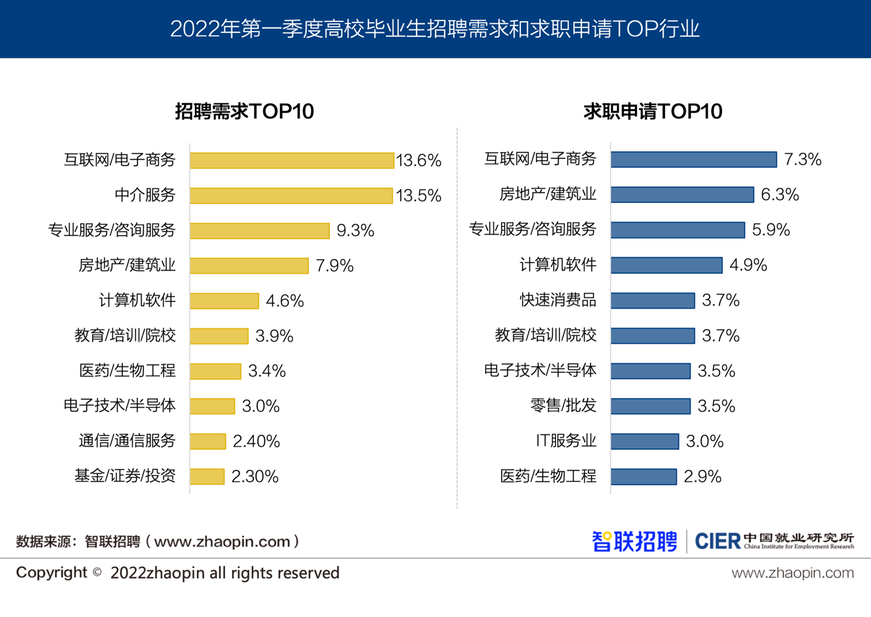 2.分行业来看,受“互联网大厂裁员”、“双减政策”等因素影响,原先大学生较为青睐的互联网与教培行业等招聘需求缩减明显。尽管通信/电信、工业自动化、生物医药等现代制造和服务业就业景气较好,但这些新兴行业仍处于起步阶段,未能填补目前较大的需求缺口。