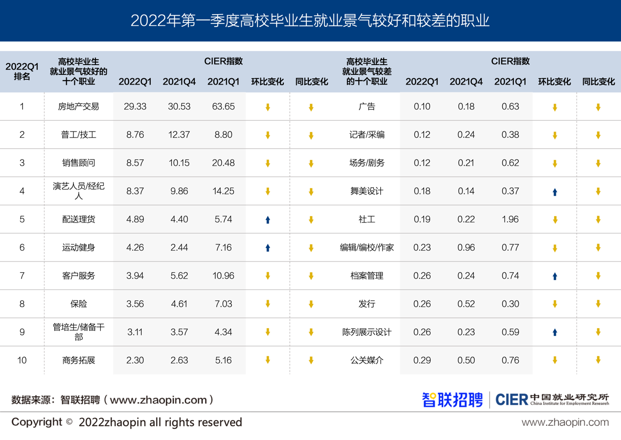 高校毕业生就业景气较好和较差的职业排名。本季度高校毕业生就业景气较好的职业为房地产交易、普工/技工、销售顾问、演艺人员/经纪人等,这些职业的CIER指数排名相对较高。但与上季度相比,除了配送/理货、运动健身职业环比上升之外,其他职业均环比下降。当前,疫情影响下带动了运输物流行业的发展,疫情期间网络购物兴起,自然带动了配送/理货职业的增加。此外,春节过后人们对运动健身的需求增加,也带动了本季度相关职业就业景气的向好。