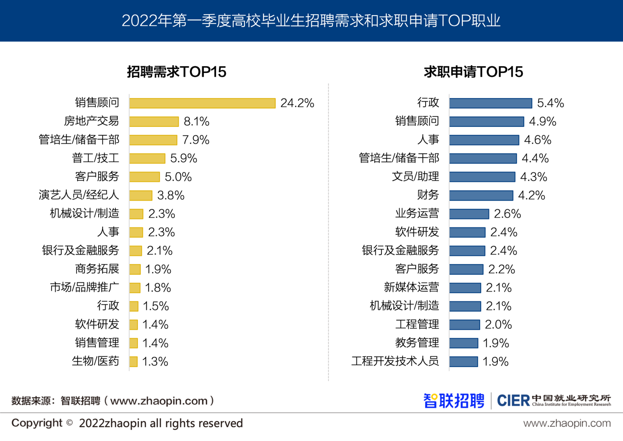 从2022一季度分职业就业形势来看,招聘需求最多职业为销售顾问、房地产交易、管培生/储备干部、普工/技工、客户服务;求职人数最多的职业为行政、销售顾问、人事、管培生/储备干部、文员/助理。