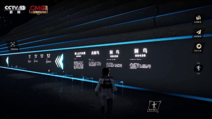 数字交互空间构建了三张探索地图:代表现在的三星堆考古发掘大棚,代表未来的三星堆数字博物馆,代表过去的古蜀王国复现。观众可通过答题方式进入,不仅可以和全国网友同步收看电视直播,还可以沉浸式体验探索考古现场,近距离观赏文物细节之美,身临其境地浏览神秘的古蜀王国。