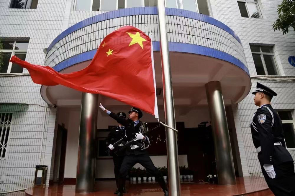 一面国旗聚力量。7月1日上午8时30分,分局101名党员民警代表在机关大院正装列队,警容严整,隆重举行升旗仪式。副区长、分局党委书记、分局长罗佶及在家局领导参加仪式。随着指挥员的号令,旗手正步入场,庄严的国歌声磅礴而起,全体民警向国旗庄严敬礼,《义勇军进行曲》久久回响,五星红旗在民警如炬的目光中冉冉升起……