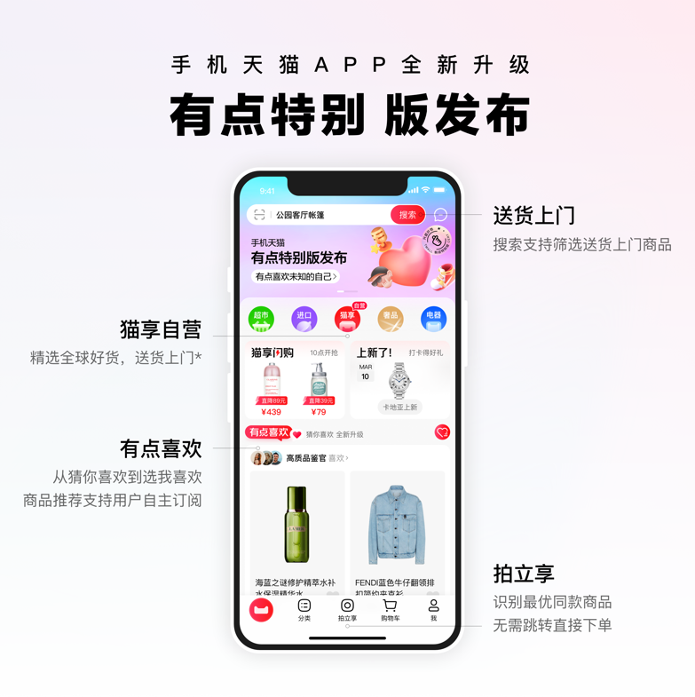 8月4日,看度记者了解到,手机天猫App全新升级,发布“有点特别版”,新版App首页采用当下流行的极简风,商品推荐不再“猜你喜欢”,用户可自主订阅兴趣标签;升级后“拍立享”拍图找货功能,从推荐多款到只推荐最优一款;同时,搜索支持筛选送货上门商品,围绕用户体验全面升级。