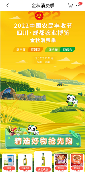活动期间,在京东网上商城开店的四川省和成都市特色农产品企业将进驻京东商城金秋消费季专场,开展线上展示展销、直播带货、专场推介等营销促销活动。出席启动仪式的京东西南区相关负责人表示,为了让消费者享受到更多福利,将采用更多元化举措,通过“导购魔方”“超值秒杀”“明星大牌”“主推爆品”“特色商品池”等促销方式,吸引全网消费者品鉴四川及成都农特产品的价值和魅力。作为一家新型实体企业,京东植根于实体经济,也始终服务于实体经济,致力于当好乡村振兴的“耕耘者”。