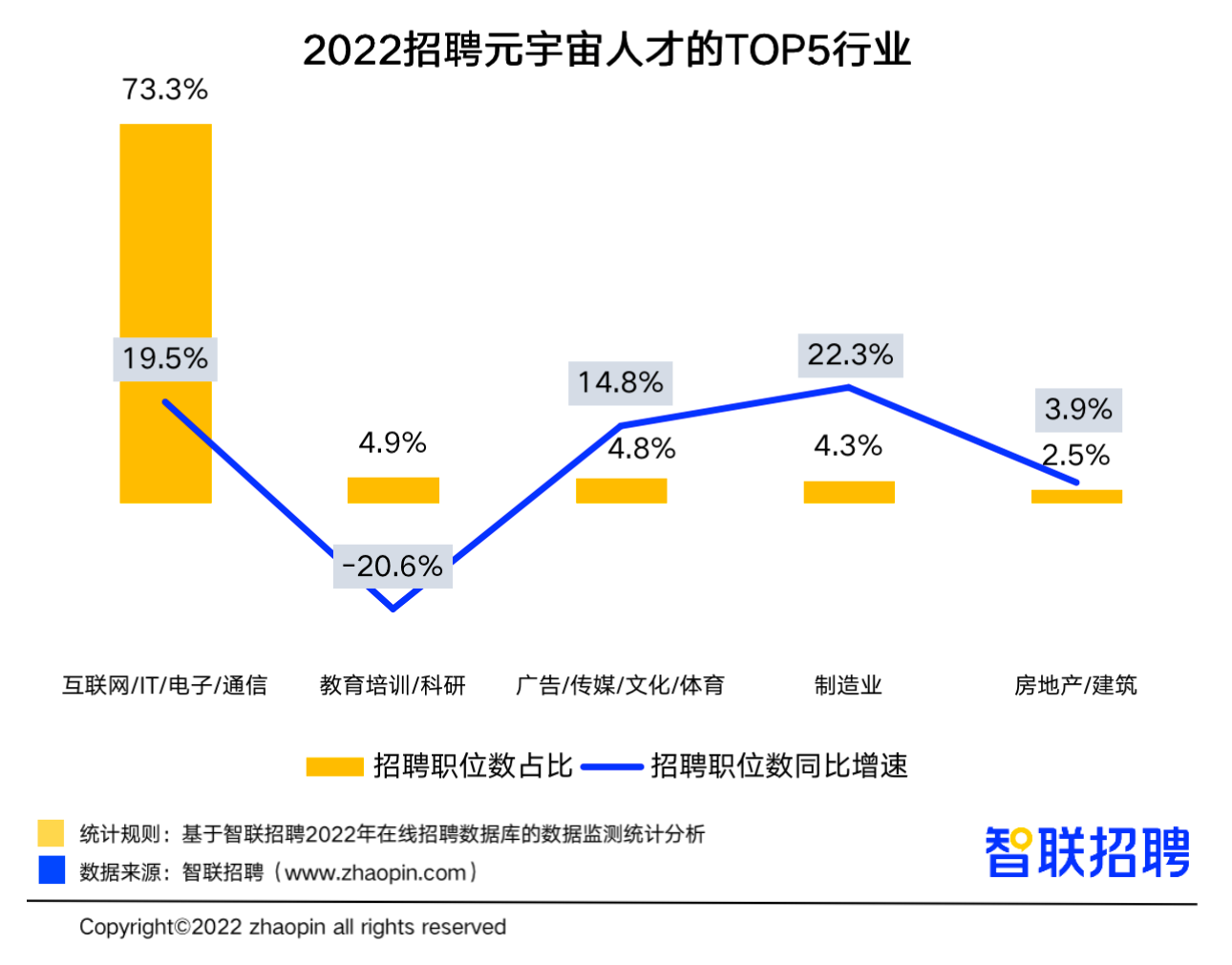 智联招聘数据显示,2022年1-7月全平台元宇宙相关招聘职位数同比增长16.6%,在疫情反复、经济增速放缓的背景下,实现了招聘较大幅度增长。分行业看,招聘元宇宙人才的TOP5行业为互联网/IT/电子/通信(职位数占比73.3%)、教育培训/科研(4.9%)、广告/传媒/文化/体育(4.8%)、制造业(4.3%)、房地产/建筑(2.5%)。可见,当前国内元宇宙技术的应用仍高度集中在信息技术产业本身,在教培、传媒、制造业、房地产等领域也逐渐开始渗透,整体仍处于初期发展阶段。值得注意的是,制造业今年1-7月招聘元宇宙岗位同比增速达22.3%,发展态势良好。