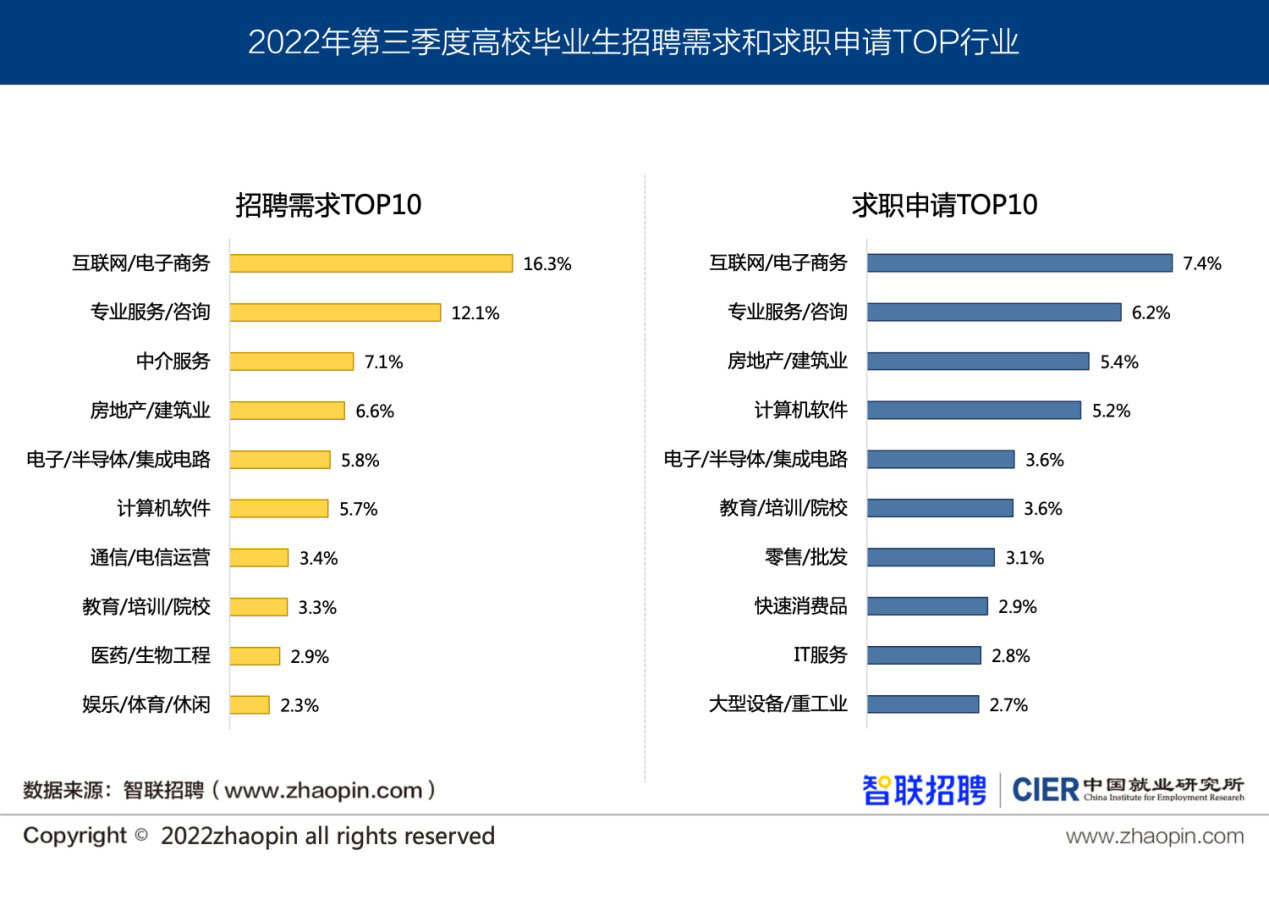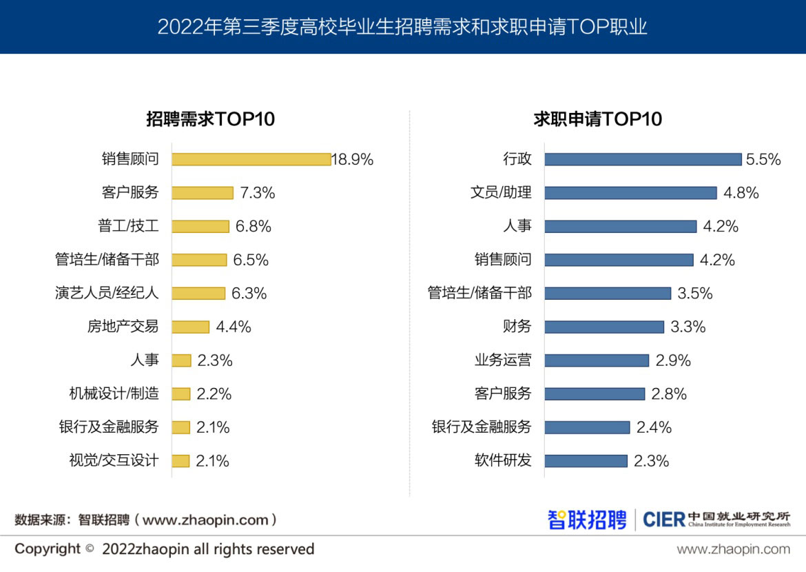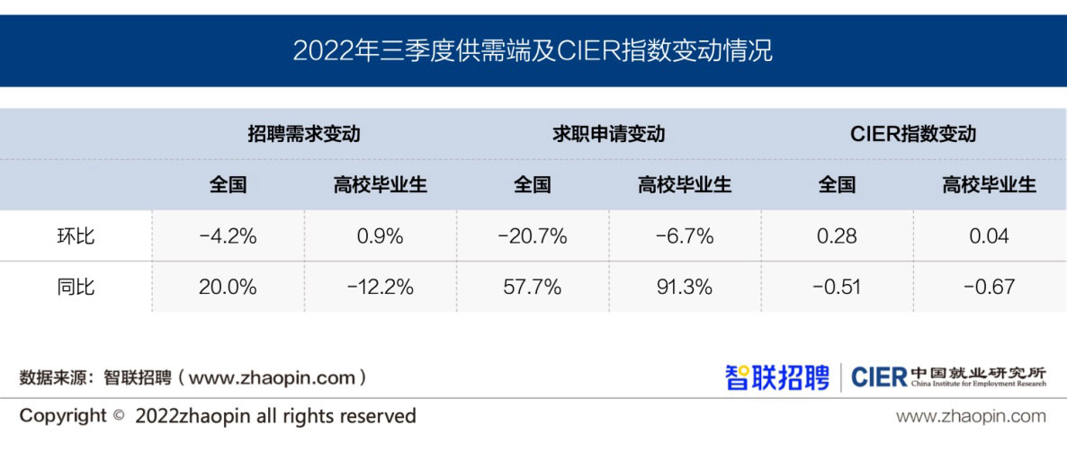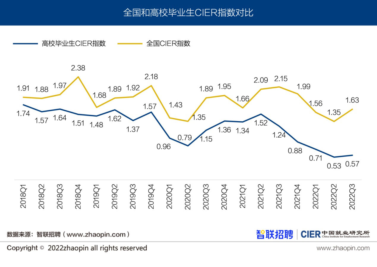 2022年三季度高校毕业生CIER指数为0.57,自二季度最低点0.53之后出现反弹。与全国市场景气指数(1.63)相比,二者差距不断拉大,结构性矛盾有所加剧。本季度高校毕业生就业市场特点总结如下: