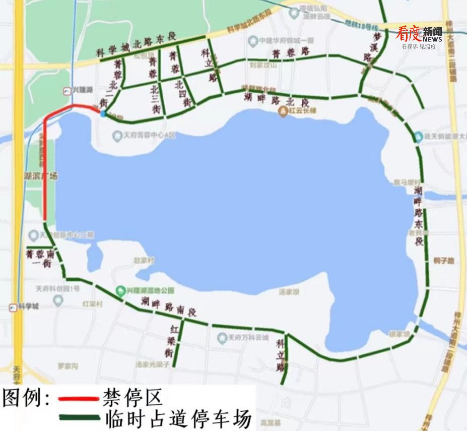 可停路段:菁蓉路北侧、菁蓉北二街双侧、菁蓉北三街东侧、菁蓉北四街东侧、科立路双侧、梦溪路双侧、菁蓉南一街北侧、红梁街双侧、科学城北路东段双侧、湖畔路内侧(起点:菁蓉北二街路口—经由:新经济产业园C区—止点:菁蓉南路路口)、湖畔路外侧(起点:菁蓉南路路口—经由:梦溪路口—止点:菁蓉北二街路口)