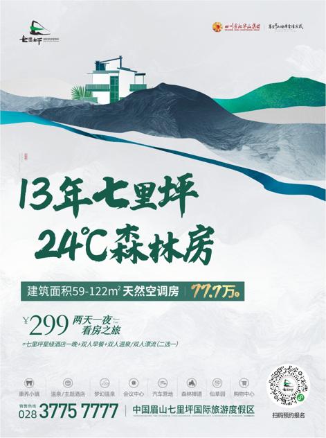 中国眉山七里坪国际旅游度假区,限量推出30套77.7万特价房源,限时推出299元的两天一夜看房之旅,看房之旅含七里坪星级酒店一晚+双人早餐+双人温泉/双人漂流<二选一>优惠,赶紧拨打报名热线028-37757777或者扫描屏幕下方二维码了解活动详情,也可登陆小程序直接报名进行预定!