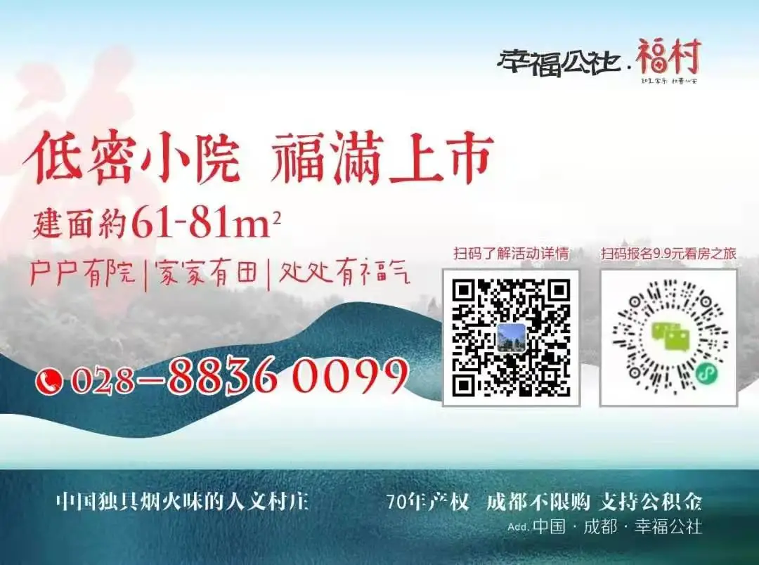 幸福公社位于成都市大邑县青霞镇,四面山环水抱,公社西面的浅丘山脉森林覆盖率95%以上,绿树成荫;空气负氧离子高达每立方厘米20000个,空气自由且新鲜。