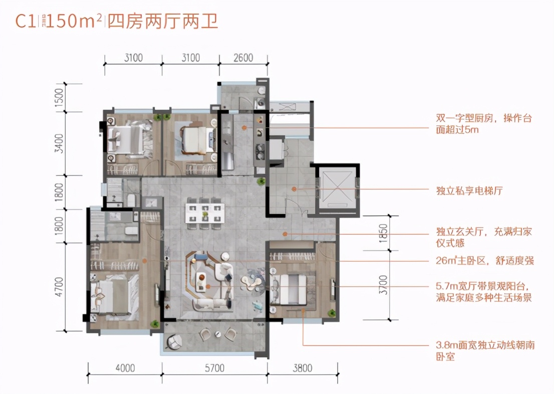 再看看建面约150㎡的四房产品,三开间朝南,经典竖厅开间约5.7米,主卧开间约4米,朝南次主卧开间约3.8米,其余两间次卧开间均为约3.1米。主要空间的尺寸表现可以媲美市场上不少170㎡高层产品。核心逻辑,依然是高得房率。