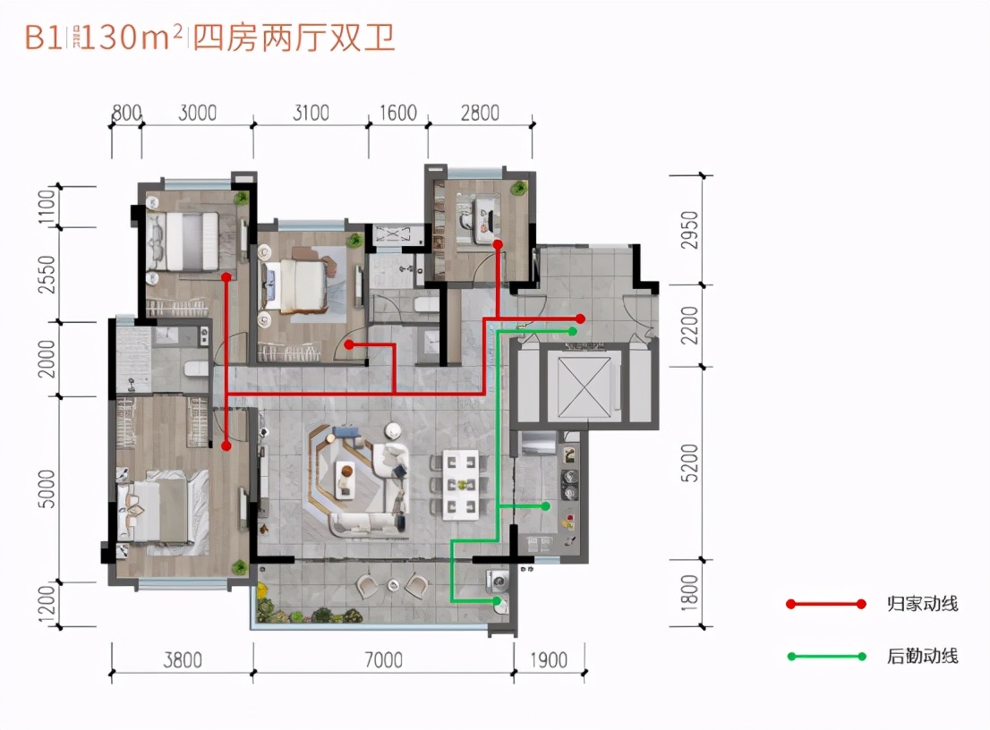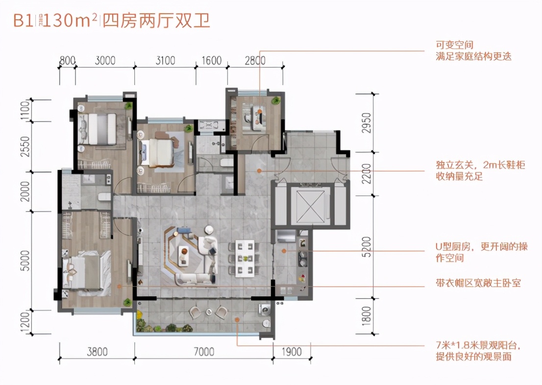 在满足功能需求的同时,建面约130㎡户型空间舒适性同样强悍。约7米横厅+约7米大阳台,约3.8米开间主卧,两次卧开间均在约3米以上,书房开间约2.8米。