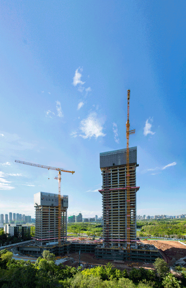 当成都开启国际大都会之路,地标建筑群的诞生是时与势的必然结果。今天封顶的A栋为「蔚蓝卡地亚中心」三栋摩天大楼的其中一栋,高度为216m。整个地标建筑群是由「蔚蓝卡地亚中心」及安达仕酒店、成都「花园城」凯悦酒店及住宅、地标双塔,商业广场组成。目前,凯悦酒店已经封顶,项目建设初具雏形。